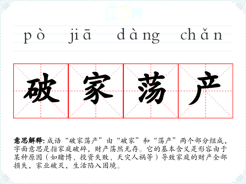 成语“破家荡产”由“破家”和“荡产”两个部分组成,字面意思是指家庭破碎,财产荡然无存。它的基本含义是形容由于某种原因(如赌博、投资失败、天灾人祸等)导致家庭的财产全部损失,家业破灭,生活陷入困境。