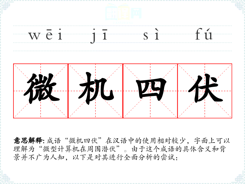 成语“微机四伏”在汉语中的使用相对较少,字面上可以理解为“微型计算机在周围潜伏”。由于这个成语的具体含义和背景并不广为人知,以下是对其进行全面分析的尝试: