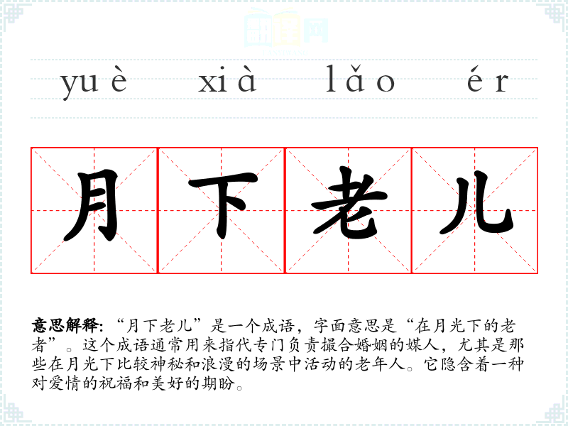 “月下老儿”是一个成语,字面意思是“在月光下的老者”。这个成语通常用来指代专门负责撮合婚姻的媒人,尤其是那些在月光下比较神秘和浪漫的场景中活动的老年人。它隐含着一种对爱情的祝福和美好的期盼。