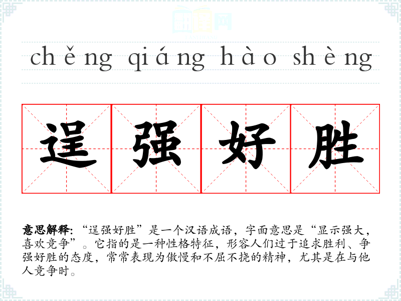 “逞强好胜”是一个汉语成语,字面意思是“显示强大,喜欢竞争”。它指的是一种性格特征,形容人们过于追求胜利、争强好胜的态度,常常表现为傲慢和不屈不挠的精神,尤其是在与他人竞争时。