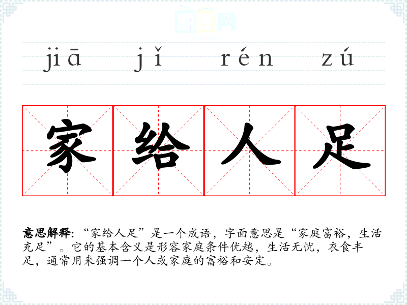 “家给人足”是一个成语,字面意思是“家庭富裕,生活充足”。它的基本含义是形容家庭条件优越,生活无忧,衣食丰足,通常用来强调一个人或家庭的富裕和安定。