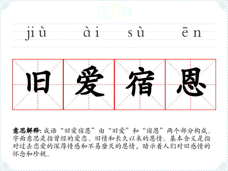 成语“旧爱宿恩”由“旧爱”和“宿恩”两个部分构成。字面意思是指曾经的爱恋、旧情和长久以来的恩情。基本含义是指对过去恋爱的深厚情感和不易磨灭的恩情,暗示着人们对旧感情的怀念和珍视。