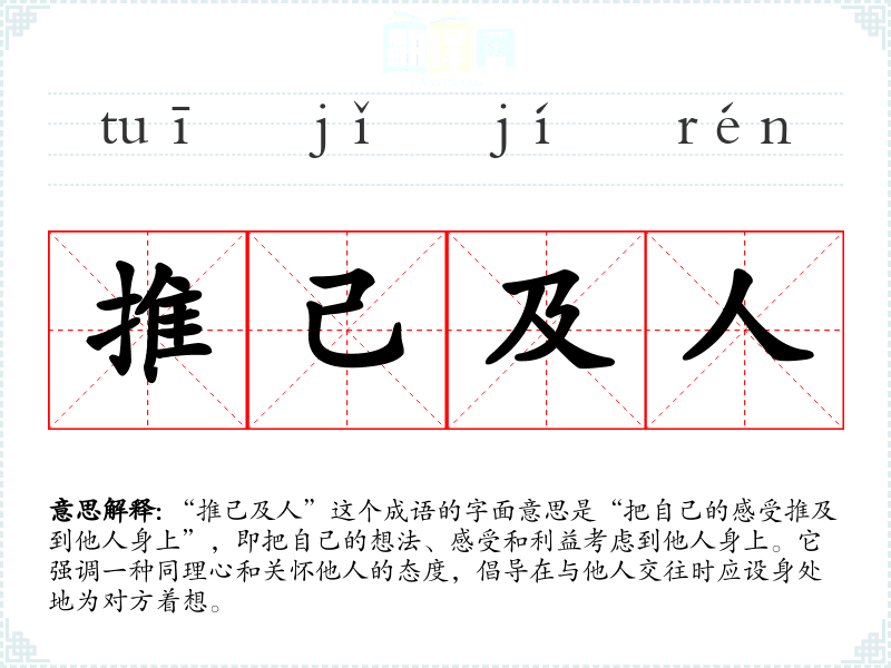 “推己及人”这个成语的字面意思是“把自己的感受推及到他人身上”,即把自己的想法、感受和利益考虑到他人身上。它强调一种同理心和关怀他人的态度,倡导在与他人交往时应设身处地为对方着想。