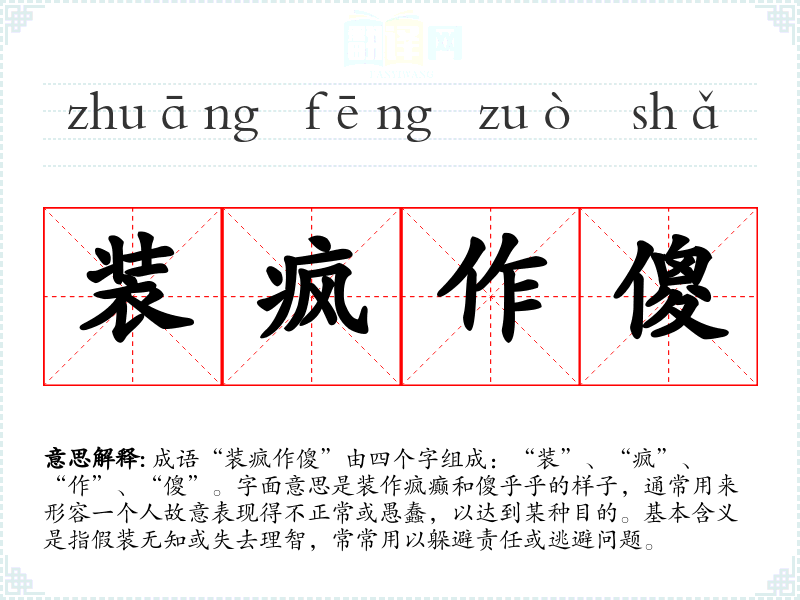 成语“装疯作傻”由四个字组成:“装”、“疯”、“作”、“傻”。字面意思是装作疯癫和傻乎乎的样子,通常用来形容一个人故意表现得不正常或愚蠢,以达到某种目的。基本含义是指假装无知或失去理智,常常用以躲避责任或逃避问题。