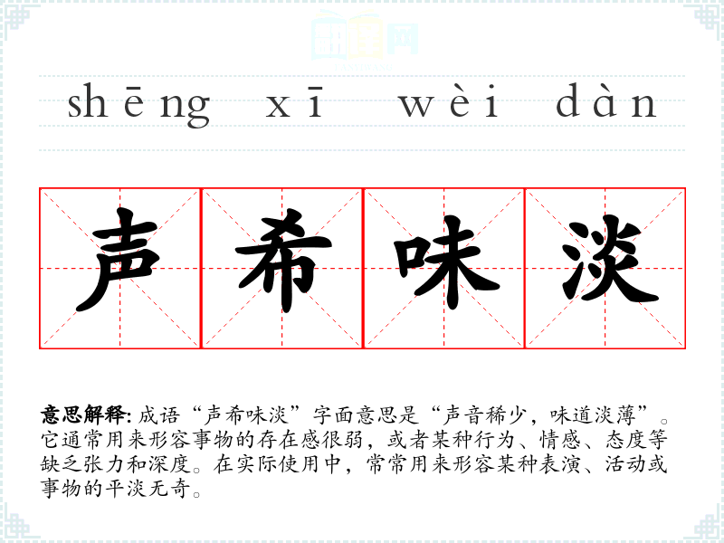 | 声希味淡 | 指平淡无奇,没有什么名声。有曲高和寡,不为人知之意。 |
