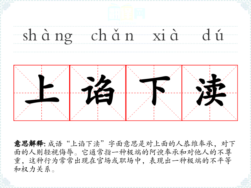 成语“上谄下渎”字面意思是对上面的人恭维奉承,对下面的人则轻视侮辱。它通常指一种极端的阿谀奉承和对他人的不尊重,这种行为常常出现在官场或职场中,表现出一种极端的不平等和权力关系。