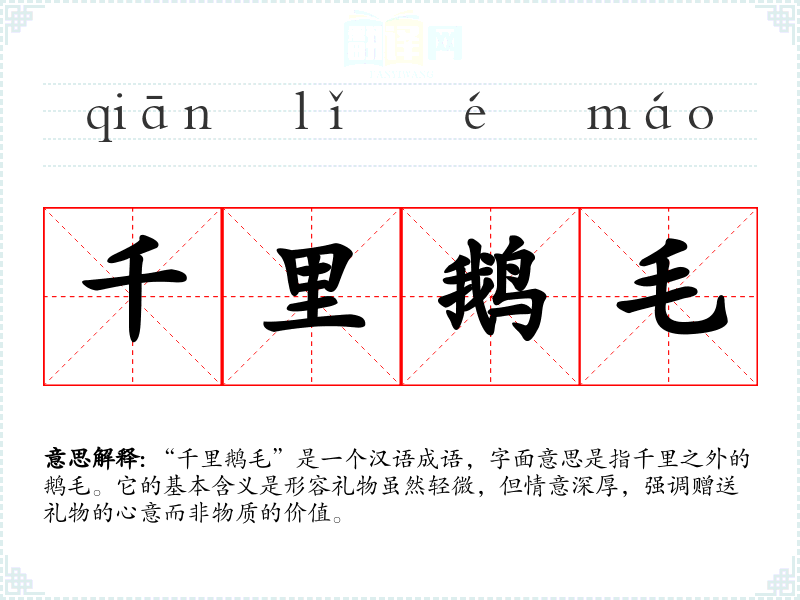 “千里鹅毛”是一个汉语成语,字面意思是指千里之外的鹅毛。它的基本含义是形容礼物虽然轻微,但情意深厚,强调赠送礼物的心意而非物质的价值。