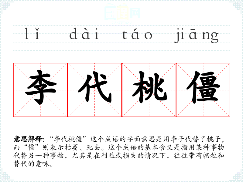 “李代桃僵”这个成语的字面意思是用李子代替了桃子,而“僵”则表示枯萎、死去。这个成语的基本含义是指用某种事物代替另一种事物,尤其是在利益或损失的情况下,往往带有牺牲和替代的意味。