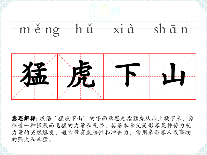 成语“猛虎下山”的字面意思是指猛虎从山上跳下来,象征着一种强烈而迅猛的力量和气势。其基本含义是形容某种势力或力量的突然爆发,通常带有威胁性和冲击力,常用来形容人或事物的强大和凶猛。