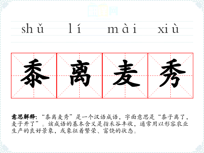 “黍离麦秀”是一个汉语成语,字面意思是“黍子离了,麦子开了”。该成语的基本含义是指禾谷丰收,通常用以形容农业生产的良好景象,或象征着繁荣、富饶的状态。