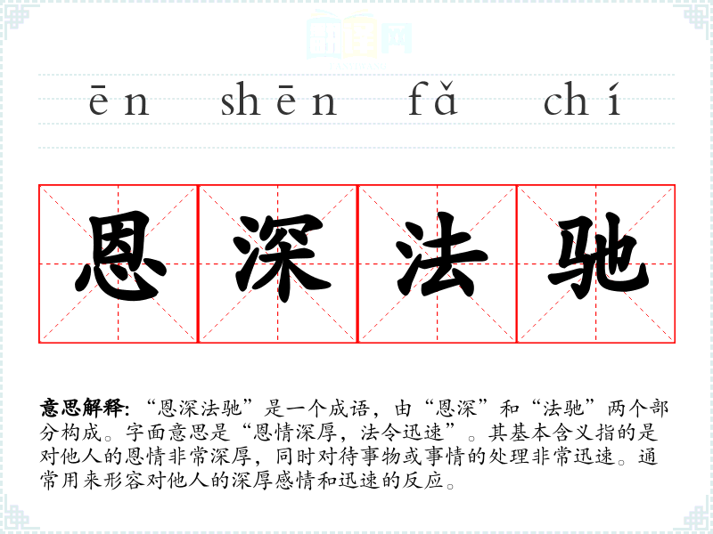 “恩深法驰”是一个成语,由“恩深”和“法驰”两个部分构成。字面意思是“恩情深厚,法令迅速”。其基本含义指的是对他人的恩情非常深厚,同时对待事物或事情的处理非常迅速。通常用来形容对他人的深厚感情和迅速的反应。