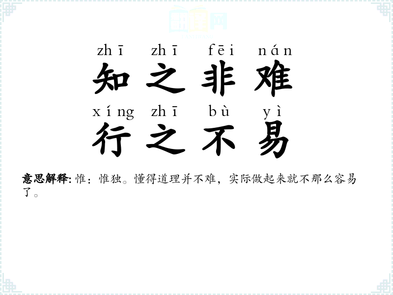 惟:惟独。懂得道理并不难,实际做起来就不那么容易了。 |