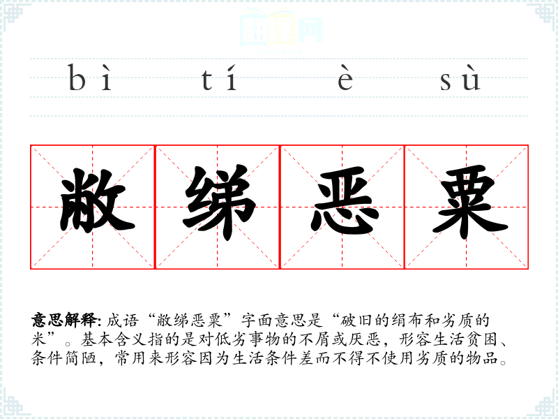 成语“敝绨恶粟”字面意思是“破旧的绢布和劣质的米”。基本含义指的是对低劣事物的不屑或厌恶,形容生活贫困、条件简陋,常用来形容因为生活条件差而不得不使用劣质的物品。