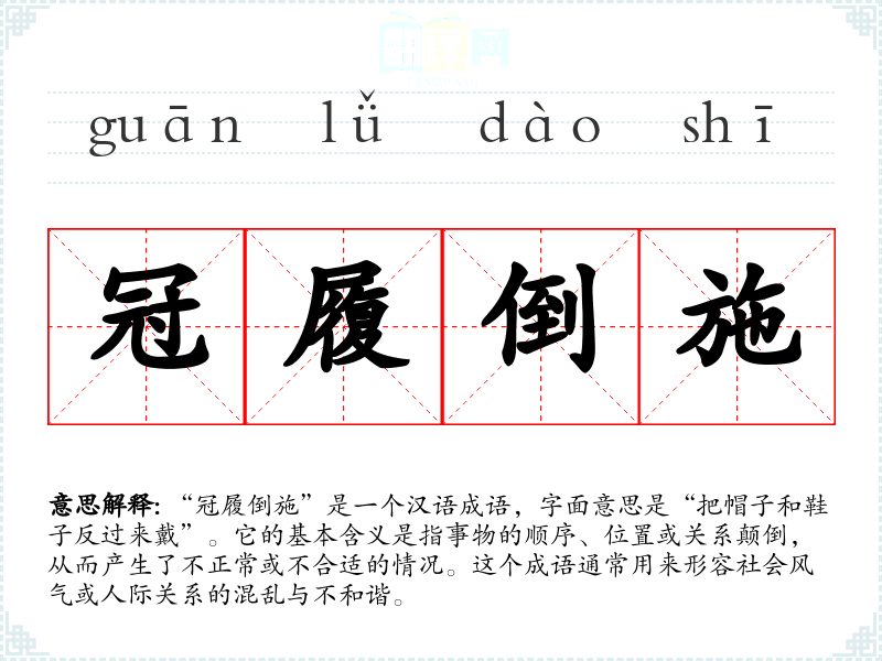 “冠履倒施”是一个汉语成语,字面意思是“把帽子和鞋子反过来戴”。它的基本含义是指事物的顺序、位置或关系颠倒,从而产生了不正常或不合适的情况。这个成语通常用来形容社会风气或人际关系的混乱与不和谐。
