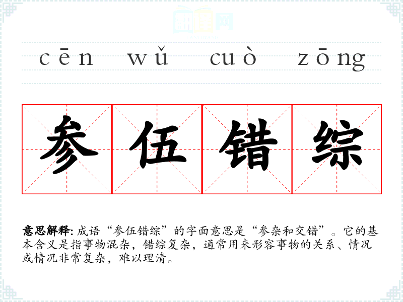 成语“参伍错综”的字面意思是“参杂和交错”。它的基本含义是指事物混杂,错综复杂,通常用来形容事物的关系、情况或情况非常复杂,难以理清。