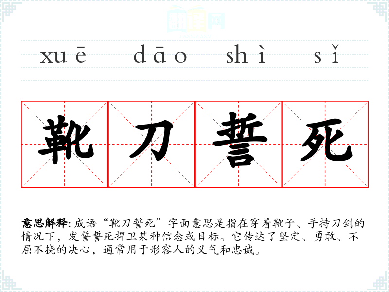成语“靴刀誓死”字面意思是指在穿着靴子、手持刀剑的情况下,发誓誓死捍卫某种信念或目标。它传达了坚定、勇敢、不屈不挠的决心,通常用于形容人的义气和忠诚。