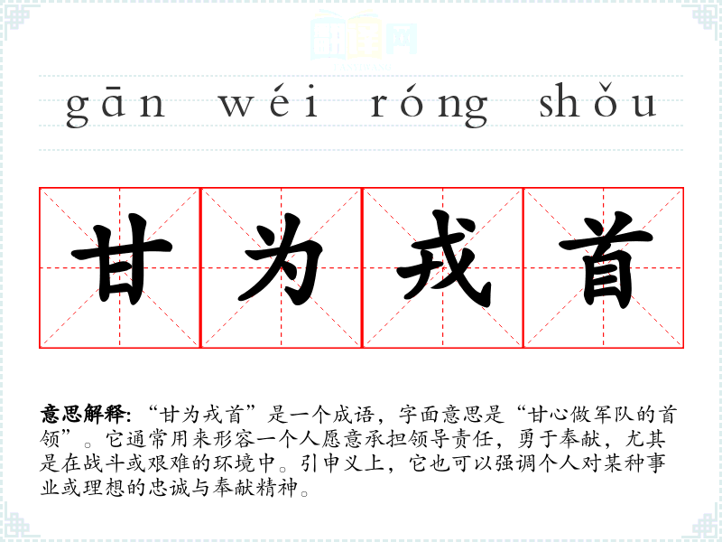 通过对“甘为戎首”的学,我深刻体会到责任感和领导力的重要性。这一成语不仅丰富了我的语言表达,也让我在生活中更加关注团队的合作与奉献精神。在未来的学和工作中,我将继续努力实践这一精神。