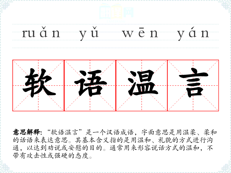 “软语温言”是一个汉语成语,字面意思是用温柔、柔和的话语来表达意思。其基本含义指的是用温和、礼貌的方式进行沟通,以达到劝说或安慰的目的。通常用来形容说话方式的温和,不带有攻击性或强硬的态度。