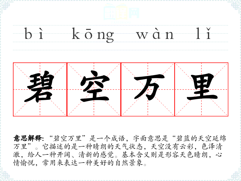 | 碧空万里 | 万里:指面积大,距离长。形容天气晴朗。 |