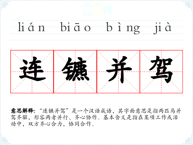 “连镳并驾”是一个汉语成语,其字面意思是指两匹马并驾齐驱,形容两者并行、齐心协作。基本含义是指在某项工作或活动中,双方齐心合力,协同合作。