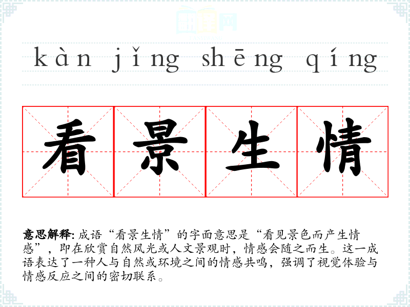 成语“看景生情”的字面意思是“看见景色而产生情感”,即在欣赏自然风光或人文景观时,情感会随之而生。这一成语表达了一种人与自然或环境之间的情感共鸣,强调了视觉体验与情感反应之间的密切联系。