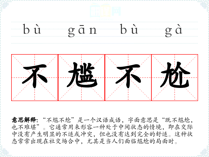 “不尴不尬”是一个汉语成语,字面意思是“既不尴尬,也不难堪”。它通常用来形容一种处于中间状态的情境,即在交际中没有产生明显的不适或冲突,但也没有达到完全的舒适。这种状态常常出现在社交场合中,尤其是当人们面临尴尬的局面时。