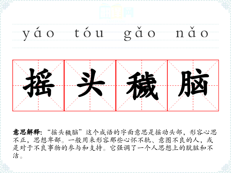 “摇头穢脑”这个成语的字面意思是摇动头部,形容心思不正,思想卑鄙。一般用来形容那些心怀不轨、意图不良的人,或是对于不良事物的参与和支持。它强调了一个人思想上的肮脏和不洁。