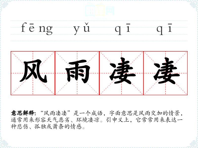 “风雨凄凄”是一个成语,字面意思是风雨交加的情景,通常用来形容天气恶劣、环境凄凉。引申义上,它常常用来表达一种悲伤、孤独或萧条的情感。