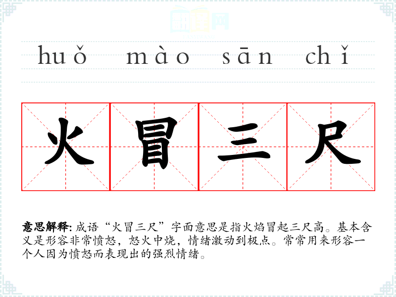 成语“火冒三尺”字面意思是指火焰冒起三尺高。基本含义是形容非常愤怒,怒火中烧,情绪激动到极点。常常用来形容一个人因为愤怒而表现出的强烈情绪。
