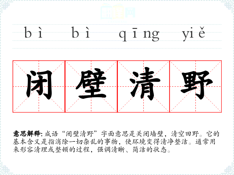 成语“闭壁清野”字面意思是关闭墙壁,清空田野。它的基本含义是指消除一切杂乱的事物,使环境变得清净整洁。通常用来形容清理或整顿的过程,强调清晰、简洁的状态。