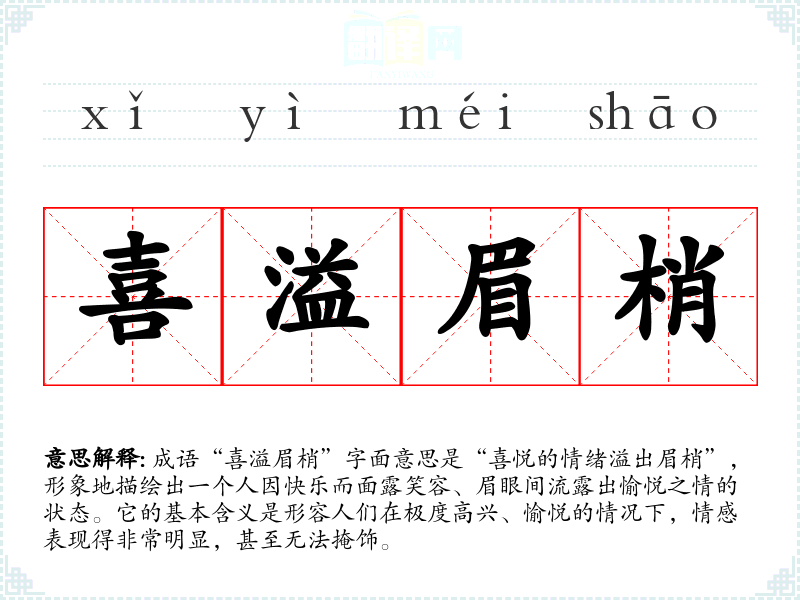 成语“喜溢眉梢”字面意思是“喜悦的情绪溢出眉梢”,形象地描绘出一个人因快乐而面露笑容、眉眼间流露出愉悦之情的状态。它的基本含义是形容人们在极度高兴、愉悦的情况下,情感表现得非常明显,甚至无法掩饰。