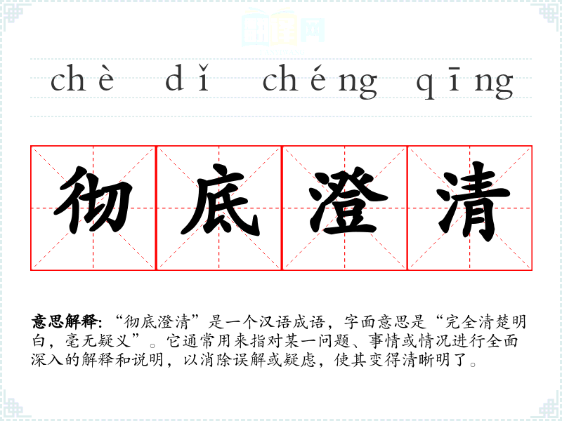 “彻底”一词意为“完全、毫无保留”,而“澄清”则指“将混淆的事物变得清晰、明了”。该成语并没有明确的文学出处或典故,但可以理解为在处理复杂问题或信息时,强调需要全面、认真地进行解释,以求达到清晰明了的效果。