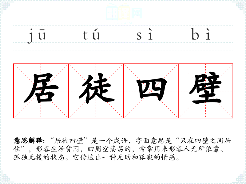 “居徒四壁”是一个成语,字面意思是“只在四壁之间居住”,形容生活贫困,四周空荡荡的,常常用来形容人无所依靠、孤独无援的状态。它传达出一种无助和孤寂的情感。