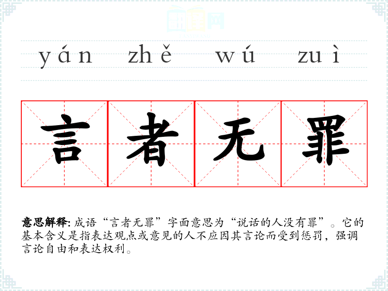 成语“言者无罪”字面意思为“说话的人没有罪”。它的基本含义是指表达观点或意见的人不应因其言论而受到惩罚,强调****和表达权利。