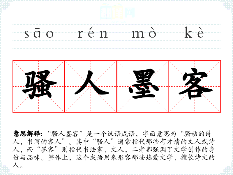| 骚人墨客 | 骚人:屈原作《离骚》,因此称屈原或《楚辞》的作者为骚人。墨客:文人。指诗人、作家等风雅的文人。 |