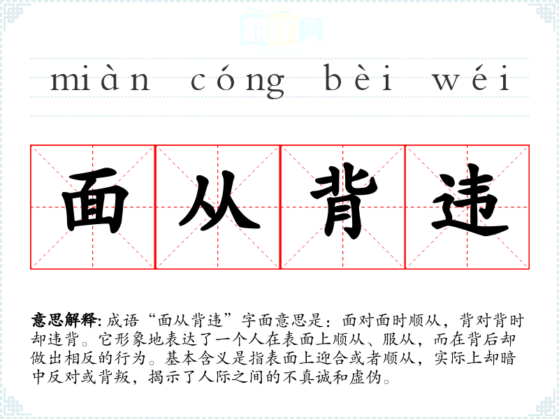 成语“面从背违”字面意思是:面对面时顺从,背对背时却违背。它形象地表达了一个人在表面上顺从、服从,而在背后却做出相反的行为。基本含义是指表面上迎合或者顺从,实际上却暗中反对或背叛,揭示了人际之间的不真诚和虚伪。