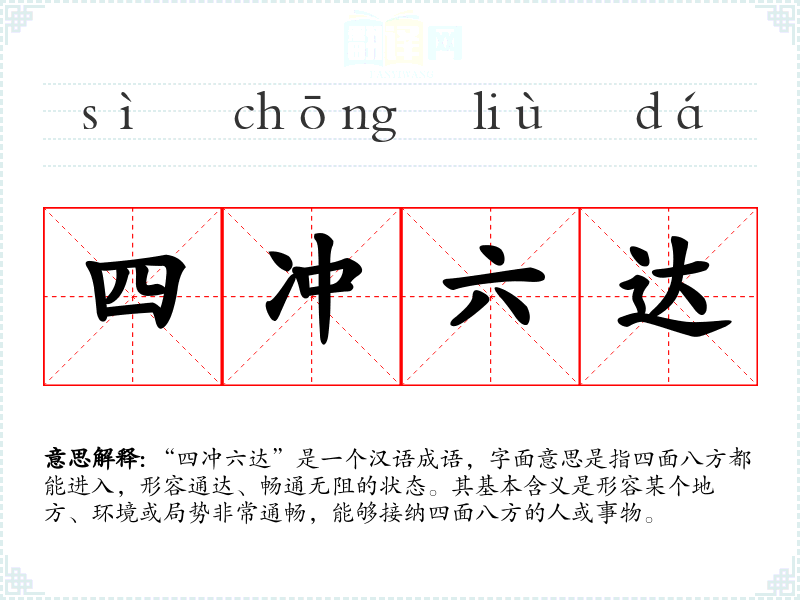 “四冲六达”是一个汉语成语,字面意思是指四面八方都能进入,形容通达、畅通无阻的状态。其基本含义是形容某个地方、环境或局势非常通畅,能够接纳四面八方的人或事物。