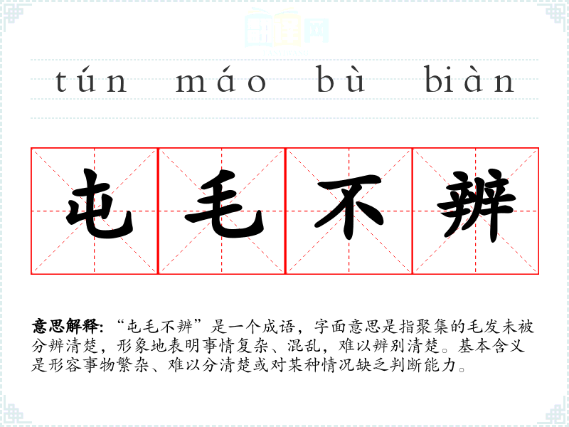 “屯毛不辨”是一个成语,字面意思是指聚集的毛发未被分辨清楚,形象地表明事情复杂、混乱,难以辨别清楚。基本含义是形容事物繁杂、难以分清楚或对某种情况缺乏判断能力。