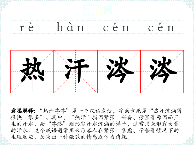 “热汗涔涔”的具体来源并不明确,但它常常出现在古典文学作品中,尤其是描述人物在艰难情况下的情景。例如,古代文人常用此成语来描绘在考场、战场或其他重大场合中因紧张而出汗的状态。这个成语通过形象化的方式,传达出一种紧迫感和辛苦的情绪。