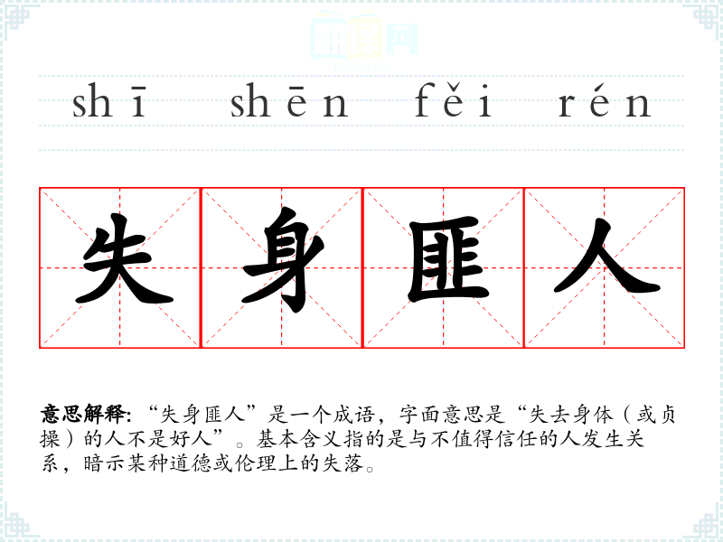 “失身匪人”是一个成语,字面意思是“失去身体(或贞操)的人不是好人”。基本含义指的是与不值得信任的人发生关系,暗示某种道德或伦理上的失落。