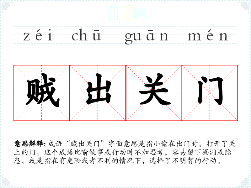 成语“贼出关门”字面意思是指小偷在出门时,打开了关上的门。这个成语比喻做事或行动时不加思考,容易留下漏洞或隐患,或是指在有危险或者不利的情况下,选择了不明智的行动。