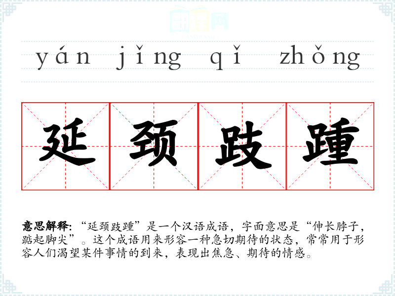 该成语出自《诗经·邶风·击鼓》中的一句:“鼓钟之声,延颈跂踵。”它描述了人在等待某种情况或某人的到来时,所表现出的急切和迫切的心情。这种形象的描绘使得成语在后世的使用中,成为了表达期待和渴望的重要词汇。
