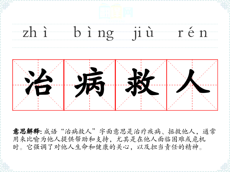 - 演讲:在公益活动或医疗相关的演讲中,演讲者可能会提到“治病救人”来激励更多的人关注医疗事业和社会公益。