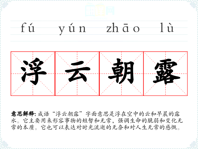 成语“浮云朝露”字面意思是浮在空中的云和早晨的露水。它主要用来形容事物的短暂和无常,强调生命的脆弱和变化无常的本质。它也可以表达对时光流逝的无奈和对人生无常的感慨。