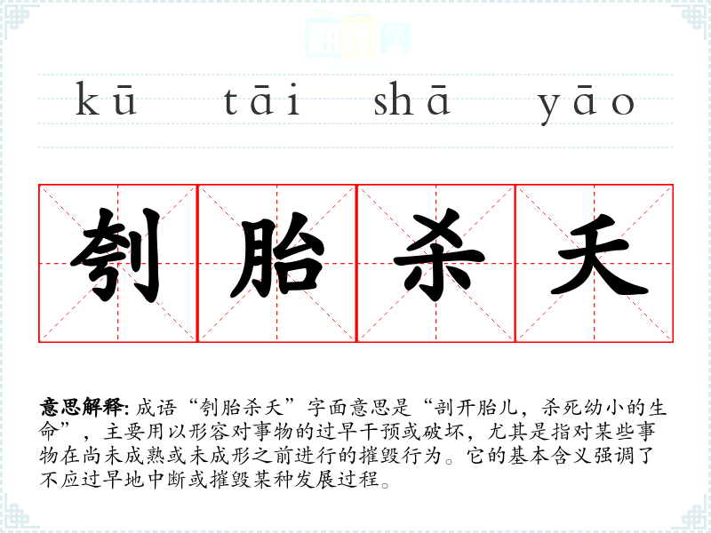 成语“刳胎杀夭”字面意思是“剖开胎儿,杀死幼小的生命”,主要用以形容对事物的过早干预或破坏,尤其是指对某些事物在尚未成熟或未成形之前进行的摧毁行为。它的基本含义强调了不应过早地中断或摧毁某种发展过程。