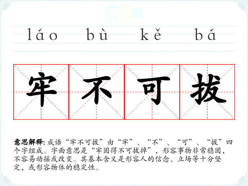 成语“牢不可拔”由“牢”、“不”、“可”、“拔”四个字组成。字面意思是“牢固得不可拔掉”,形容事物非常稳固,不容易动摇或改变。其基本含义是形容人的信念、立场等十分坚定,或形容物体的稳定性。