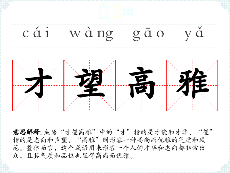 成语“才望高雅”中的“才”指的是才能和才华,“望”指的是志向和声望,“高雅”则形容一种高尚而优雅的气质和风范。整体而言,这个成语用来形容一个人的才华和志向都非常出众,且其气质和品位也显得高尚而优雅。