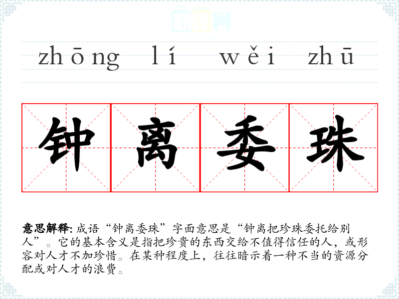 “钟离委珠”源于古代的历史故事。钟离是一位有名的贤士,他曾将珍珠委托给不懂珍惜的人,结果珍珠被遗忘或损坏。这一故事反映了对珍贵事物的不珍惜与浪费,强调了在选择信任对象时的谨慎。