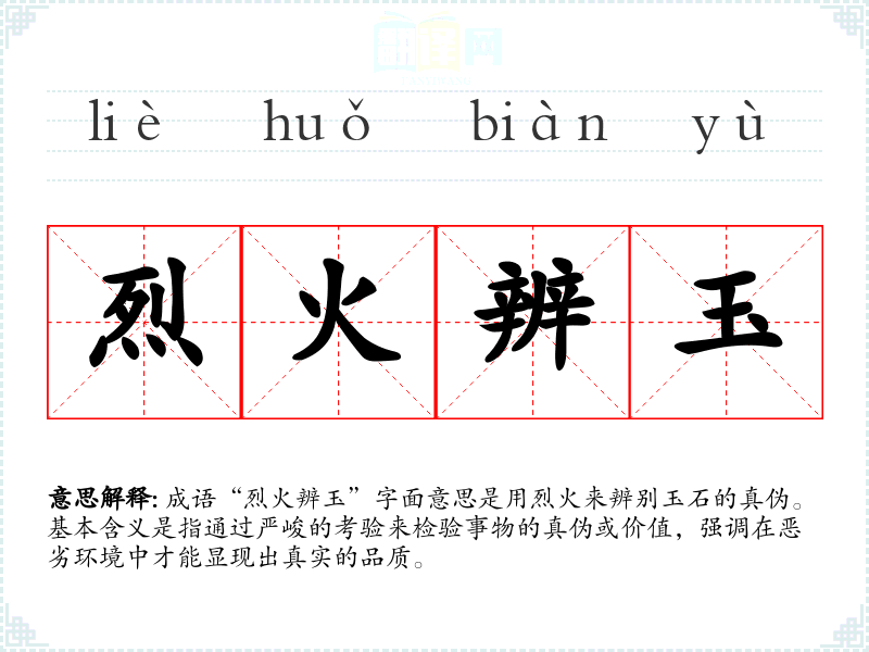 成语“烈火辨玉”字面意思是用烈火来辨别玉石的真伪。基本含义是指通过严峻的考验来检验事物的真伪或价值,强调在恶劣环境中才能显现出真实的品质。
