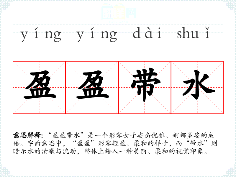 “盈盈带水”是一个形容女子姿态优雅、婀娜多姿的成语。字面意思中,“盈盈”形容轻盈、柔和的样子,而“带水”则暗示水的清澈与流动,整体上给人一种美丽、柔和的视觉印象。
